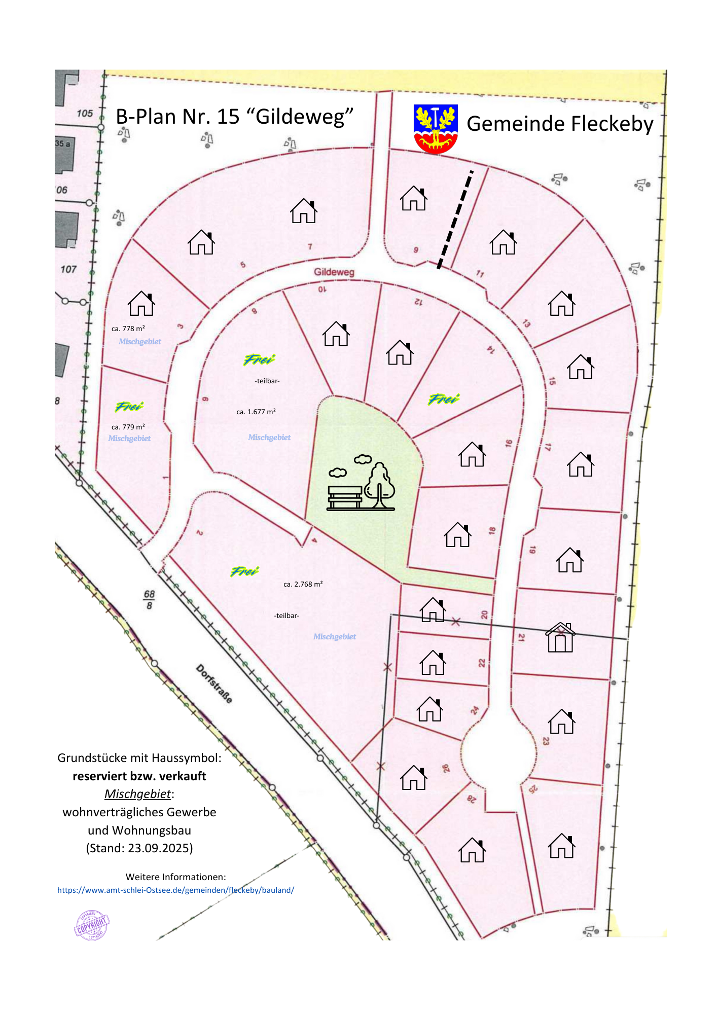 Senden Sie bei Interesse eine kurze E-Mail mit weiteren Kontaktdaten an gemeinde[at]fleckeby.de und erkundigen Sie sich nach dem Stand der Reservierung, der noch freien Grundstücke.